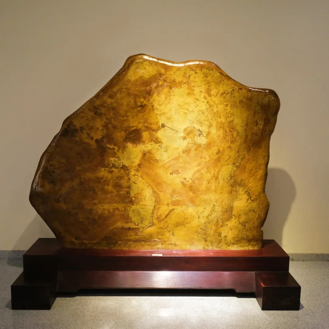 黄蜡石是石英岩矿物受地质变动影响,长期受酸性土壤和地热火山温度的双重催化变质而成,因石表具有蜡状质感而得名。品质良好的黄蜡石有着田黄般的颜色,翡翠的硬度。明清时期,广东粤东和潮汕地区就己收藏黄蜡石,据永安县县志记载:“永安产蜡石,贡于朝,盛于名也。”此石外形圆润,色调厚重,光泽柔和属黄蜡石中的晶蜡,石表凹凸不平,纹路纵横交错,犹如“筋骨裸露”。石肤如同软蜡,触之并无一般石头的冰冷感。